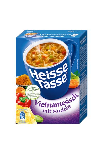 Total Blue livreaza din stoc Heisse Tasse Supa Vietnameza cu taietei, 100% fabricata in Germania.Supa vietnameza cu taietei de la Heisse Tasse este grozava pentru pauza de pranz sau mai tarziu seara si cel mai important, contine legume adevărate.Oricui ii plac ardeii, prazul, ceapa, cervilul, chiar și usturoiul, ii va plăcea cu siguranță. Un gust grozav! Totul fără potentiatori de aromă, coloranți artificiali.Magazinul nostru online iti aduce o diversitate de supe din Germania de cea mai buna calitate pentru a-ti starni pofta si curiozitatea.Continut si greutate: 1 pachet contine 3 plicuri de supa