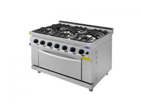 Masina de gatit cu sase arzatoare si cuptor, constructie inox, alimentare gaz natural sau GPL, valva de siguranta si termocupla, fiecare arzator functioneaza independent, temperatura 50-300*C.