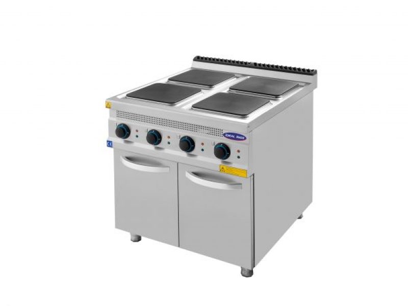 Masina de gatit electrica cu patru plite patrate pe suport si spatiu depozitare deschis, dimensiuni plita 300x300 mm, constructie inox, 3 trepte de incalzire, fiecare arzator functioneaza independent.