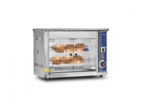Rotisorul pe gaz cu o capacitate de 6 pui este realizat din inox si prevazut cu vitrina dubla (geam fata si spate), cu sertar pentru colectarea grasimii si cu iluminare interna. Fiecare arzator functioneaza independent, este prevazut cu valve de siguranta si termocupla.